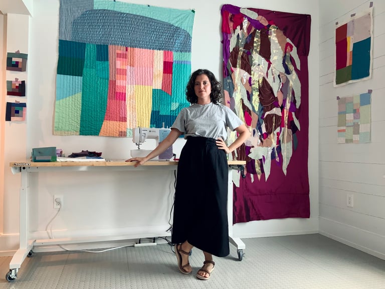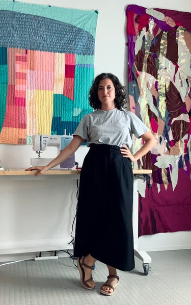 I am a textile artist and my quilts are portraits of my environment in abstract form. My work is rooted in my experience of place, seasonality, and memory. I grew up in Copenhagen, Denmark and I now live in New York City and my quilts express my experience of living in urban environments. As I move through my environment, I notice site-specific colors, shapes, textures, temperature, and seasonal signs. All this makes it into my work in abstract form. I use second-hand textiles and I consider each piece to be a conversation with my materials. Time is another important ingredient in my work as hand-quilting is a slow and meditative process. I construct textile maps of moments of feeling truly rooted in my environment. This allows me to feel more connected both to where I came from and to where I currently live.